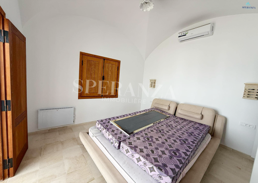 Speranza immobilière Hammamet vous propose à la vente Cette villa style moderne situé à Hammamet Sud . L'entrée bénéficie d'un jardin gazonné avec un piscine. La partie jour est composée principalement d'un salon lumineux grâce à ses fenêtre qui offre une vue sur le jardin,une cuisine aménagée avec des espaces de rangements ,et une salle d’eau pour les invités.Quant à la partie nuit dispose une suite parentale,deux chambre à coucher.Et un garage .